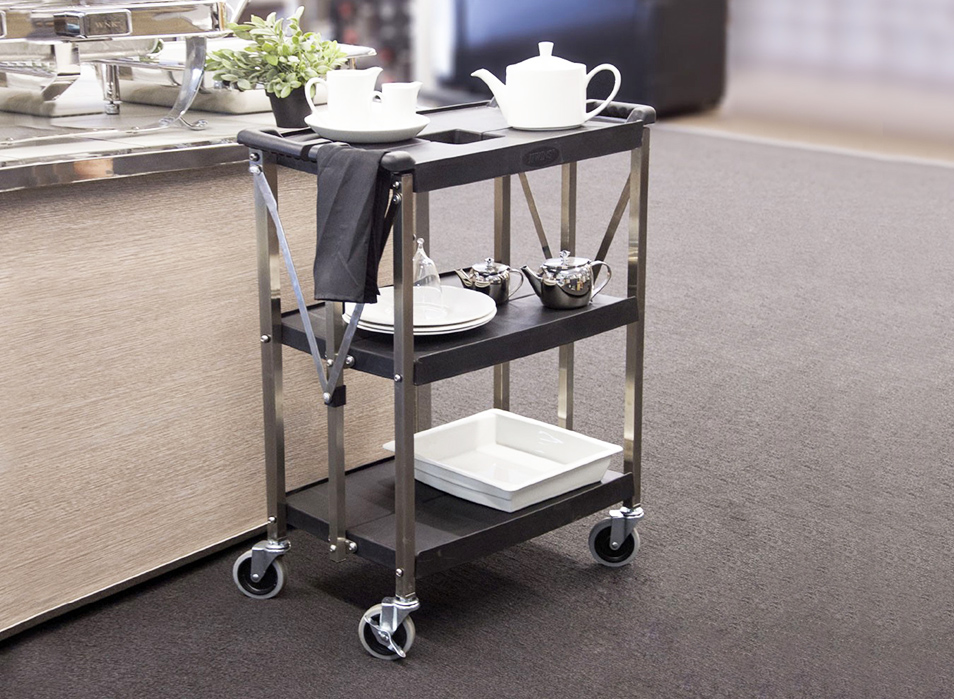 堅厚的不銹鋼材料,車表面帶有磨砂處理,美觀耐用卡扣設計,可快速、簡單的折疊或展開餐車; 折疊存放可減少50%的面積; 符合人體工學的把手設計,操作舒適; 4”萬向靜音輪,其中兩個帶剎;安全,安靜可承重150KG; 廣泛使用于各類餐廳和酒店.